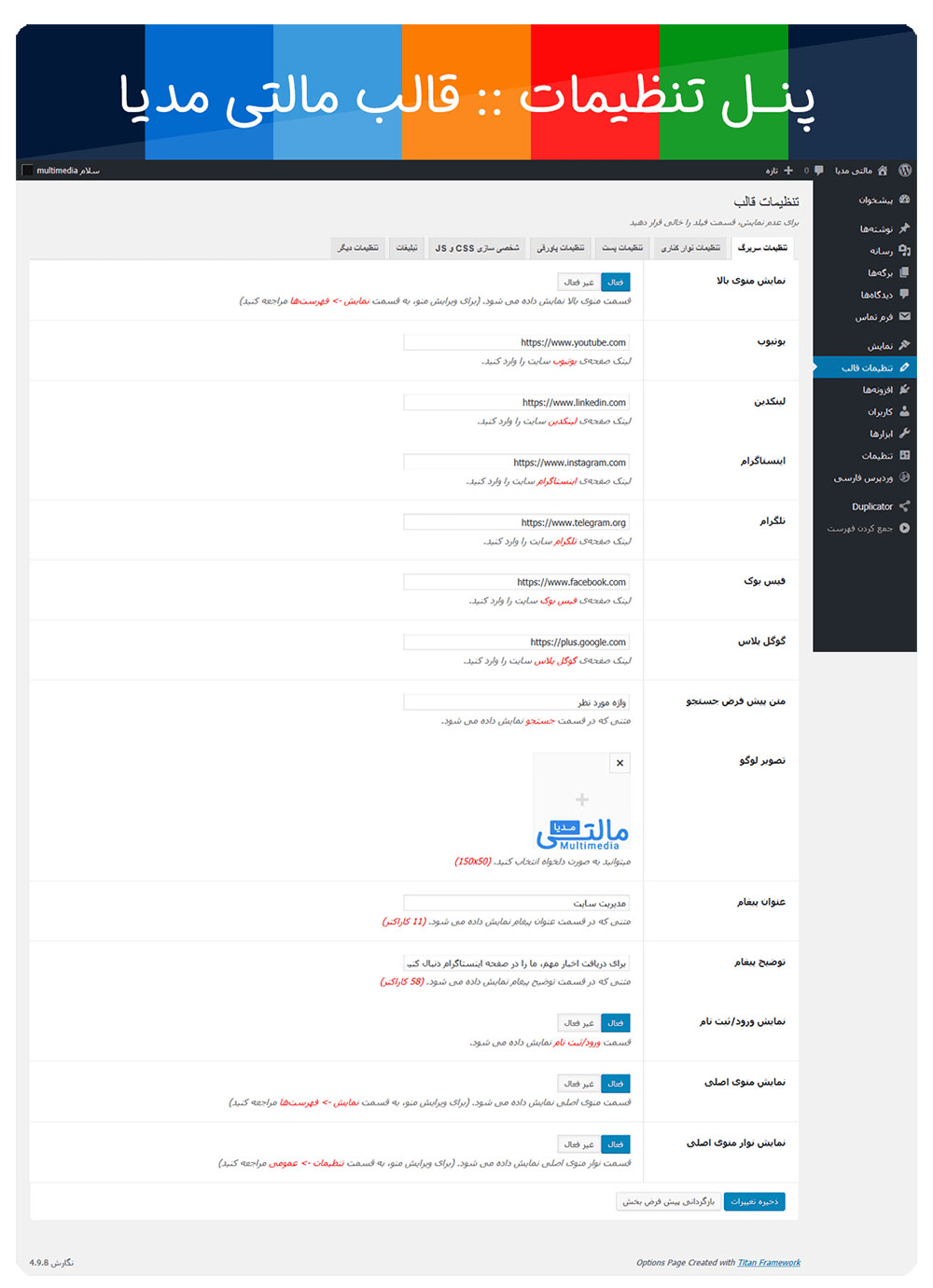 یکی از مهمترین ویژگیهای قالب multimedia مالتی مدیا ، پنل تنظیمات قدرتمند آن است. شما بدون نیاز به حتی یک خط کدنویسی، میتوانید رنگها، فونتها، لوگو، چیدمان، بخشهای مختلف و تنظیمات نمایش را شخصیسازی کنید.