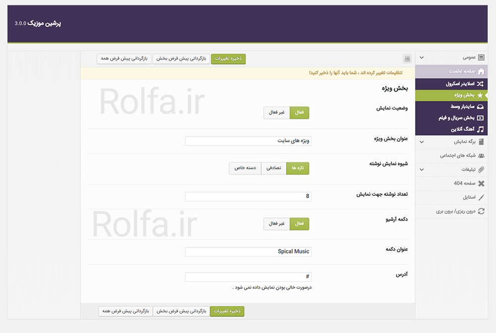 پنل تنظیمات قدرتمند با امکان فعال/غیرفعالسازی بخشهای مختلف