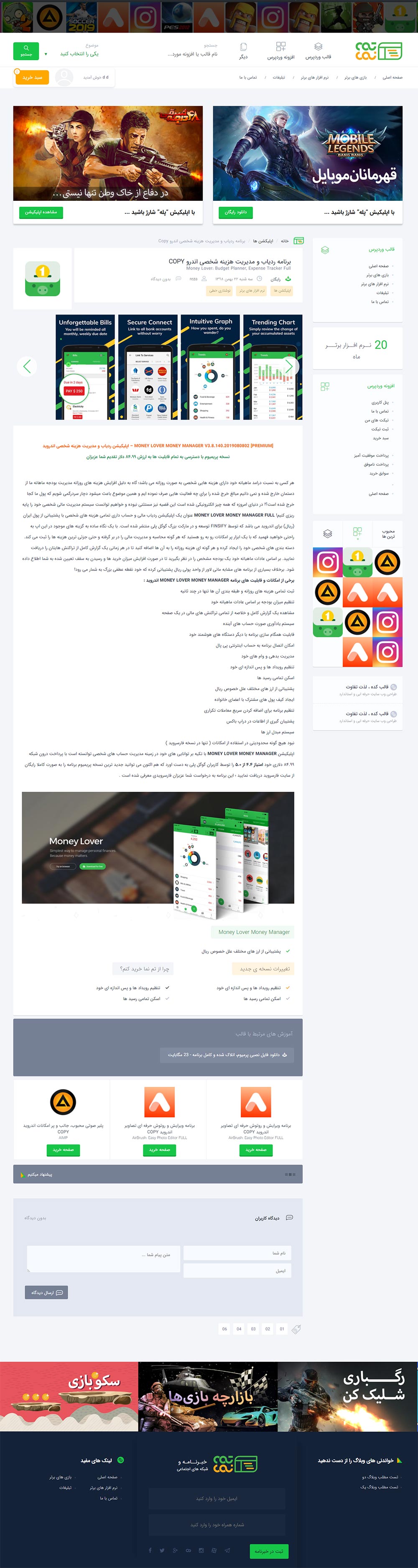 طراحی اختصاصی برای دانلود اپلیکیشن: صفحات برنامهها با چیدمان حرفهای شامل توضیحات، اسکرینشات، نسخه، حجم و لینک دانلود